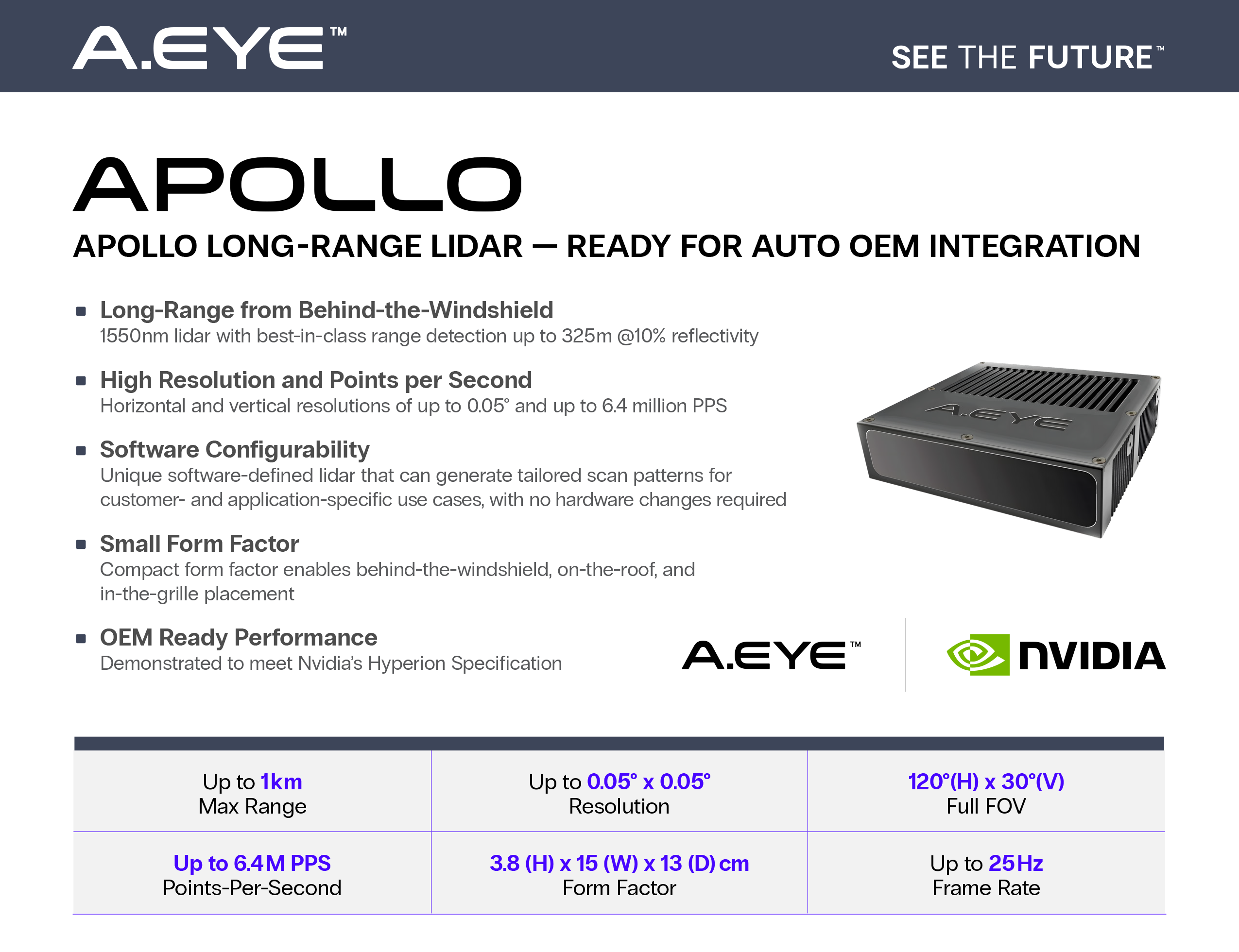 Apollo provides high-resolution data across a wide field of view, enabling quick identification and reaction to objects and threats from afar. It serves as a powerful alternative or enhancement to conventional camera-based imaging technologies, supporting critical safety features for vehicles operating at high speeds.